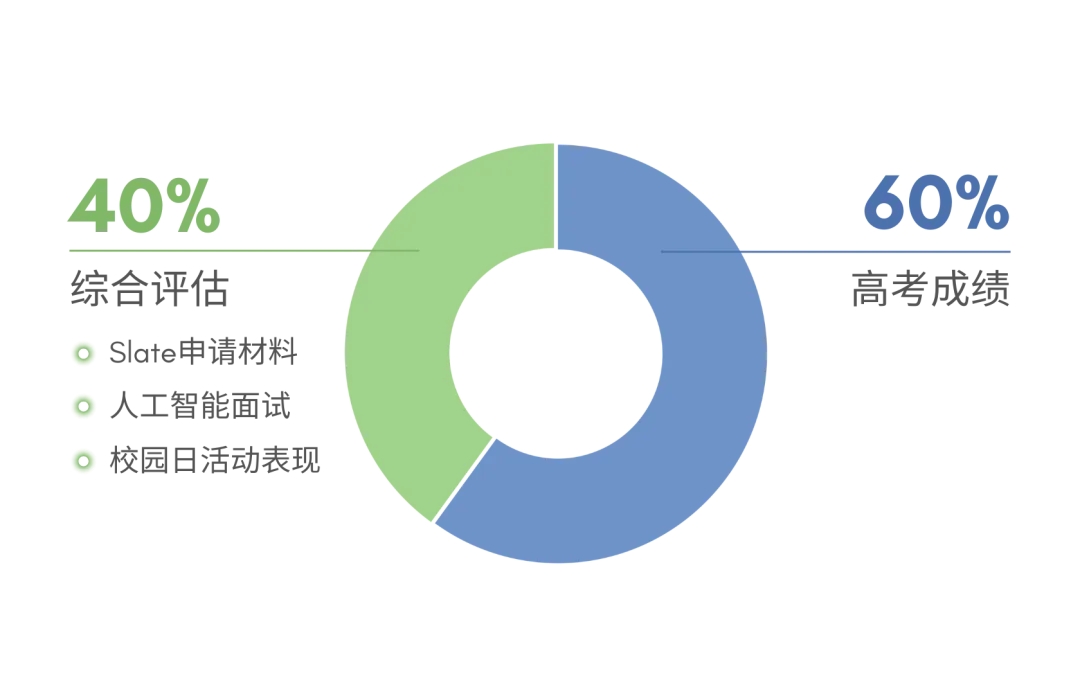 学校自主综合评估成绩:占综合得分的40%(包括对Slate入学申请材料和人工智能面试结果的评估以及申请者“校园日活动”表现)