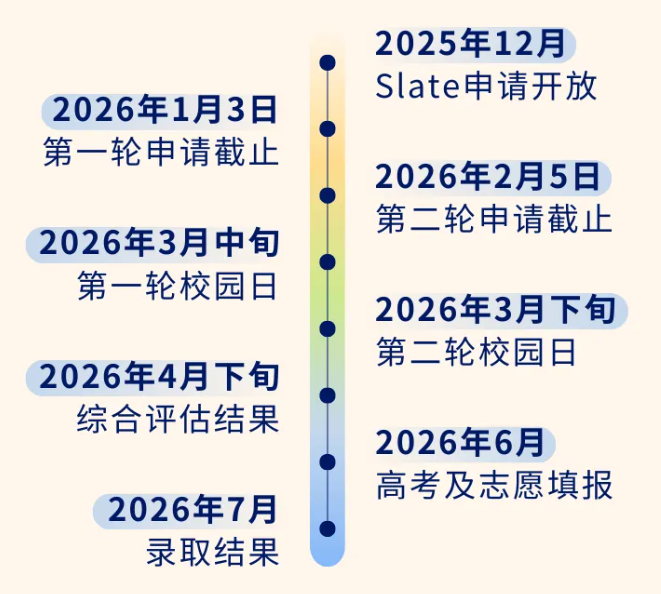 注:2026年入学有两个申请轮次,截止日期分别是2026年1月3日(午夜23:59)和2月5日(午夜23:59),两个轮次的申请分别对应3月举办的多场次的校园日活动参加时间。无论在哪个轮次申请,我校都会采用同样的标准来对申请材料进行评估打分,但我们鼓励申请者尽量能够在第一轮次提交申请。